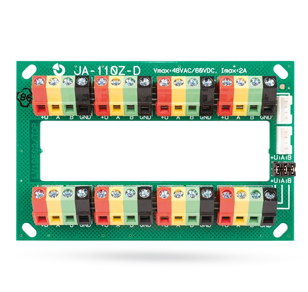 Je určený na pripojenie vodičov vo väčších zbernicových inštaláciách systému JABLOTRON 100+. Odpojením prepojok je možné ho rozdeliť na dve nezávislé zbernicové vetvy.