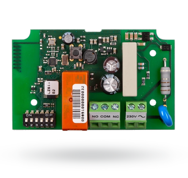 Bezdrôtový napájací modul JA-150N (16 A/250 V AC) kopíruje stav zvoleného výstupu PG (PG 1 až PG 32). Konkrétny výstup PG sa na module adresuje pomocou DIP prepínačov.