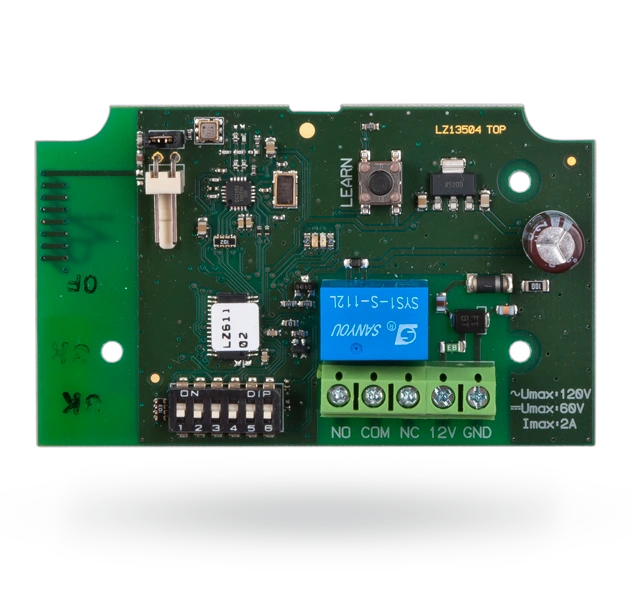 Bezdrôtový signalizačný modul JA-151N (2 A/60 V) kopíruje stav vybraného výstupu PG (PG 1 až PG 32). Konkrétny výstup PG sa na module adresuje pomocou prepínačov DIP.