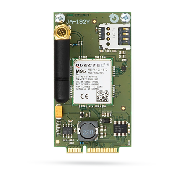 Centrálna jednotka vybavená modulom JA-192Y komunikuje s centrálou prostredníctvom mobilnej siete, umožňuje diaľkové ovládanie cez webovú a mobilnú aplikáciu a odosiela SMS a hlasové správy o poplachoch.